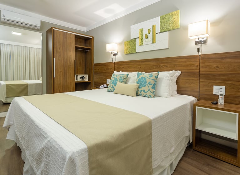 Nossos quartos são projetados para oferecer o máximo de conforto, com decoração moderna e todas as comodidades necessárias para uma estadia relaxante.
